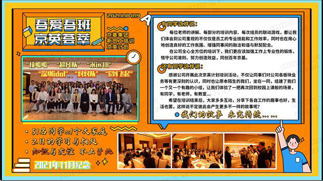 After two days of intense and orderly learning and exchanges in the "Jingying Program", Class 1 - "We Love Our Class" of the "Jingying Program" was formally established, where six teams, i.e., "First-rate Team", "Shenzhen Idol Team", "Amazing Team", "Yes Team", "Forever 18 Team", and "Wonderful Team", united and collaborated to jointly complete all the learning of this training. With this, the first session of the "Jingying Program" came to a successful conclusion. This two-day training was only the first-phase training of the "Jingying Program", and the subsequent advanced training will focus on the role change, job competency, etc. of the new employees, where more collisions of wisdom with the trainees are expected, to jointly promote the "Jingying Program".