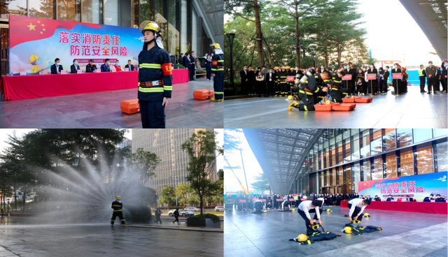 Leaders from Futian District Fire and Rescue Brigade, Futian District Shatou Subdistrict Office, Futian District Zhuzilin Fire Squadron, Shenzhen Municipal Public Security Bureau Futian Branch Shatou Police Station, Xiasha Community, etc. participated in the fire drill; they watched the practical operation such as fire control staff receiving the alarm, forcing the elevators to land, and starting smoke control and fire broadcasting in the fire control center of Kingkey Timemark; they also watched the on-site emergency response such as fire suppression, evacuation, technical disposal, and rescue in the building via the video monitoring screen.