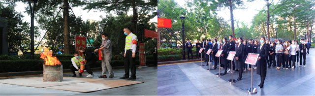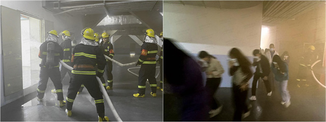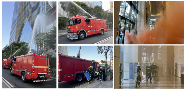 After the completion of tasks such as evacuation and fire suppression, all the participants watched related firefighting demonstrations in the north square, including firefighter uniform wearing demonstration, air breathing apparatus wearing demonstration, gas mask wearing demonstration, fire hydrant connection and squirting water demonstration, and oil drum fire extinguishing demonstration.