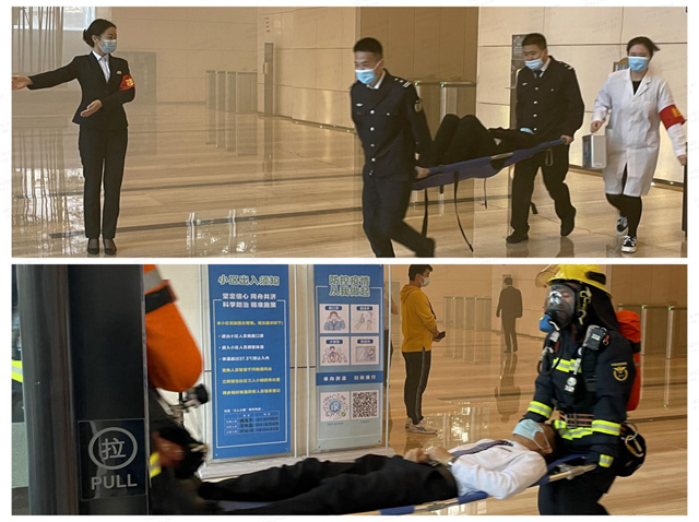 The air-conditioner room on the 16th floor of Block A was assumed to catch fire at 16:00. Upon receipt of the fire alarm, the firefighting and evacuation contingency plan was immediately initiated, according to which the field command post conducted command and dispatch in the control center.